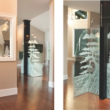 Sandblasting a three-dimensional relief in heavy float glass is Carved Glass. Combining this with our “finger friendly broken edge” makes for dramatic WOW! piece of art. We carefully and purposely create the edges, the glass only looks dangerous, as we sand and polish the edge to make it safe. These panels are often set in pony wall and openings and used as room dividers. Carved and sandblasted (etched) glass can also be used in doors and windows.